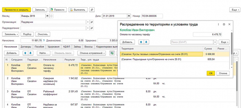 - Отражение больничных и отпусков по объектам пропорционально основной заработной платы или по последнему объекту, на котором работал сотрудник.